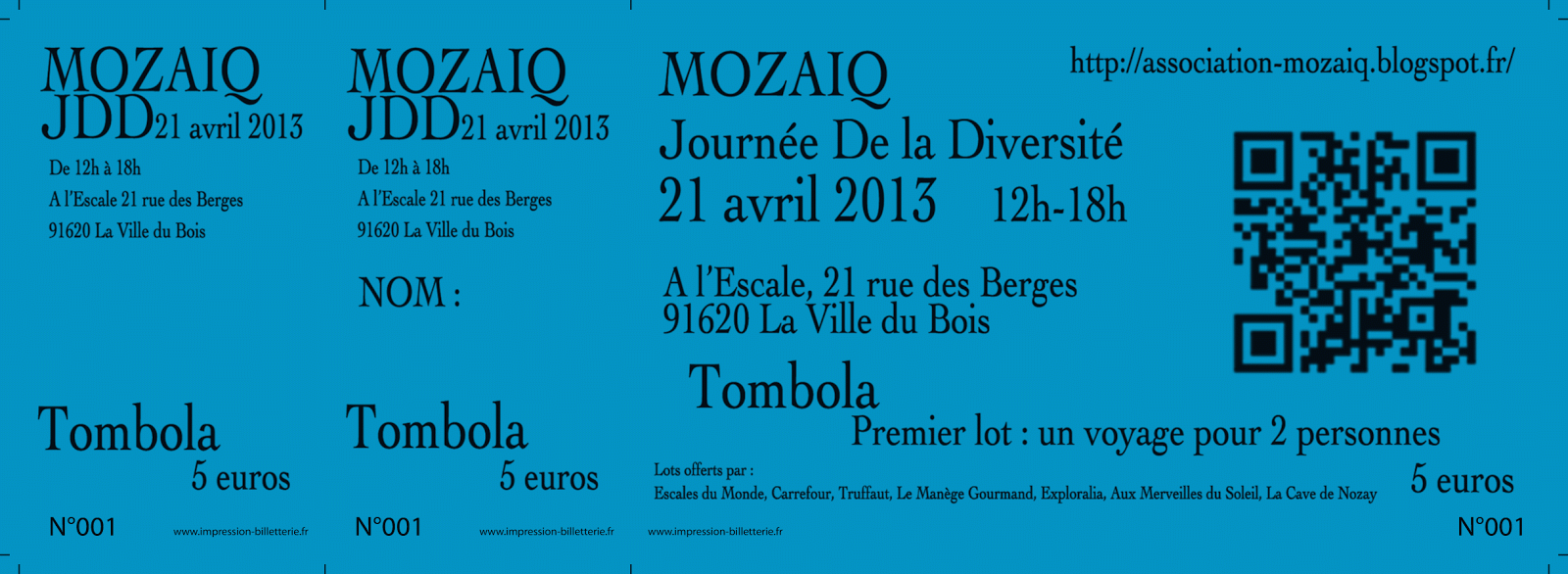 Si vous ne pouvez pas venir le 21, ce qui serait dommage, samedi 13 avril, Mozaïq sera à l’entrée principal du Centre Commercial de La Ville du Bois avec des flyers et des tickets à vendre!!! Qu’on se le dise!