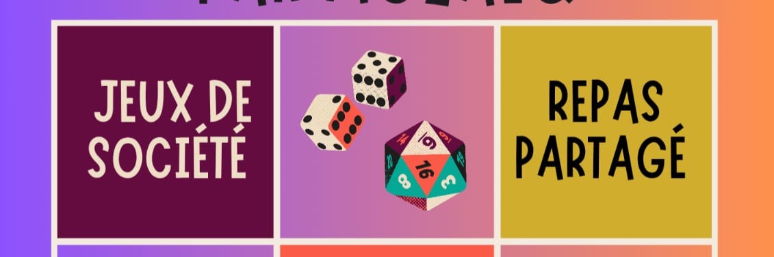 Un vendredi par mois, nous vous proposons de venir partager une pause avec nous, à la Maison Culturelle des Joncs Marins, à la Ville du Bois. Au programme : démarrage vers 19h00 avec un repas partagé (chacun amène ce qu’il veut) histoire de poser l’ambiance et d’attendre tout le monde. Ensuite, on passe aux jeux…