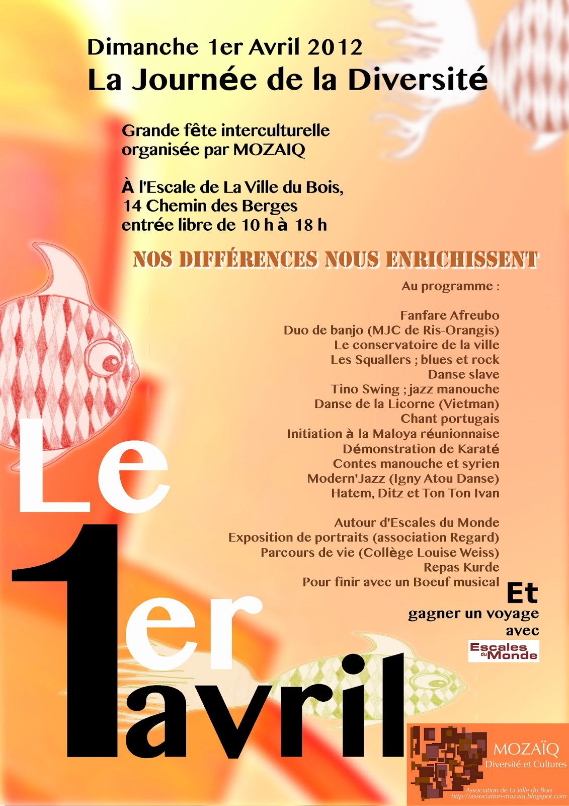 Merci de diffuser autour de vous Catégorie : UncategorizedPar Mozaïq29 février 2012Laisser un commentaire Auteur : Mozaïq Association créée en 2010 Navigation articlePrécédent Article précédent :Quand d’autres associations vont dans le même sens que nous…SuivantArticle suivant :Le programme tout chaud!Related PostsIMAGES & PALABRES le 18 mars22 février 2018Après les Fêtes20 décembre 2017MARCHE DE NOEL21 novembre 2017Le film de la JDD 2017, à voir absolument!!!6 septembre 2017Magnifique JDD22 mai 2017Journée Mondiale de la Diversité Culturelle, c’est le 21 mai18 mai 2017