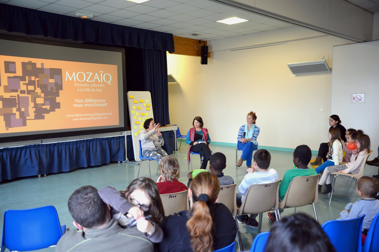 Ce Dimanche 20 mars 2016, à 15h, l’association Mozaïq a réuni près de 80 personnes dont 25 enfants autour du film de Michel Ocelot « Azur et Asmar ». L’occasion d’un débat autour des enfants multiculturels, enfants dont les parents sont eux-mêmes issus de deux pays, de deux régions, de deux religions, de deux cultures différentes. L’expertise de Dominique Bodineau (orthophoniste spécialiste des enfants biculturels) et celle d’Inayatte Ben-Slimane (directrice d’école à Massy, issue de l’immigration) ont rendu le débat passionnant. Le langage, la diversité, les racines, les histoires familiales sont des sujets qui ont donné lieu à des témoignages riches et touchants d’un public très participatif. La venue notable de l’association AFAAM de Massy a permis un éclairage aussi sur le monde africain. Comme le dit la mère d’Asmar dans le film « la couleur de leur sang est la même » pour imager que malgré des différences, nous sommes tous des Etres Humains.