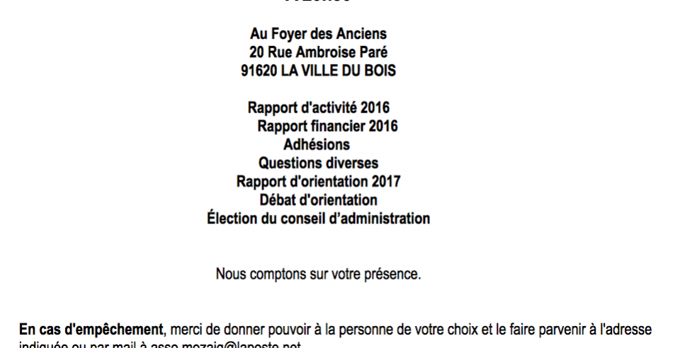 Déc212016UncategorizedAvis à nos membres et toute personne qui souhaite nous rejoindre, le 13 janvier aura lieu notre AG! Catégorie : UncategorizedPar Mozaïq21 décembre 2016Laisser un commentaire Auteur : Mozaïq Association créée en 2010 Navigation articlePrécédent Article précédent :Premier rendez-vous 2017SuivantArticle suivant :Super journéeRelated PostsIMAGES & PALABRES le 18 mars22 février 2018Après les Fêtes20 décembre 2017MARCHE DE NOEL21 novembre 2017Le film de la JDD 2017, à voir absolument!!!6 septembre 2017Magnifique JDD22 mai 2017Journée Mondiale de la Diversité Culturelle, c’est le 21 mai18 mai 2017